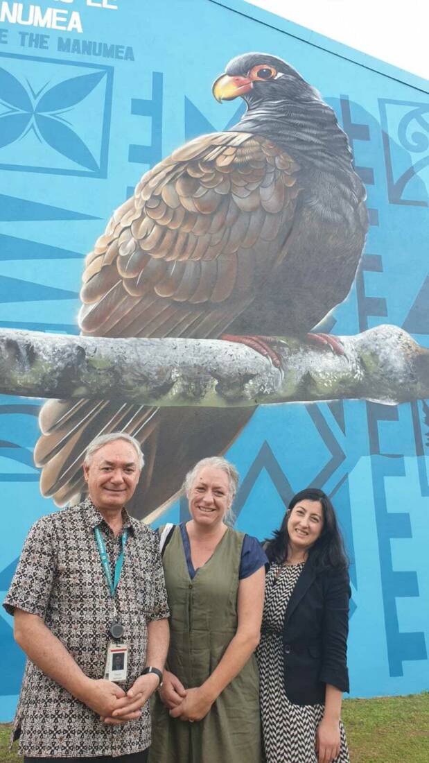 Vicki (middle) and Zuleika (right) are pictured with the High Commissioner outside Samoa’s first ever mural depicting the manumea (an endangered bird), on the walls of the New Zealand High Commission. The mural was recently completed by New Zealand artists.